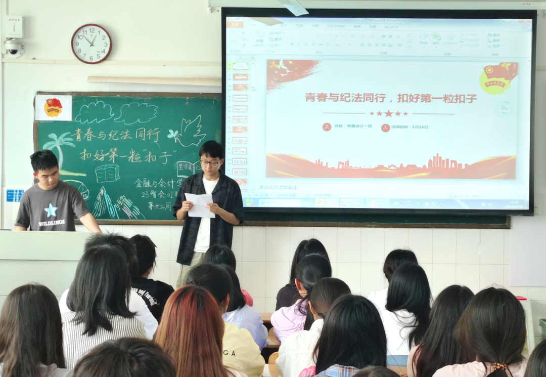 伴随着嘹亮的团歌声,各团支部组织的团课相继开展。首先,各班团支书通过分享一些青春与纪法同行的社会案例,让同学们明白了学习党纪条规的必要性。然后,各班学生代表分享了自己学习习近平总书记关于党的纪律建设重要论述的心得体会,并举出相关案例,让同学们明白了党纪学习教育的重要性。最后,团支书带领同学们总结此次团课,并呼吁同学们坚守“青”心向党的政治本色,永葆“青“廉向阳的廉洁底色,擦亮“青”力 向上的担当成色。