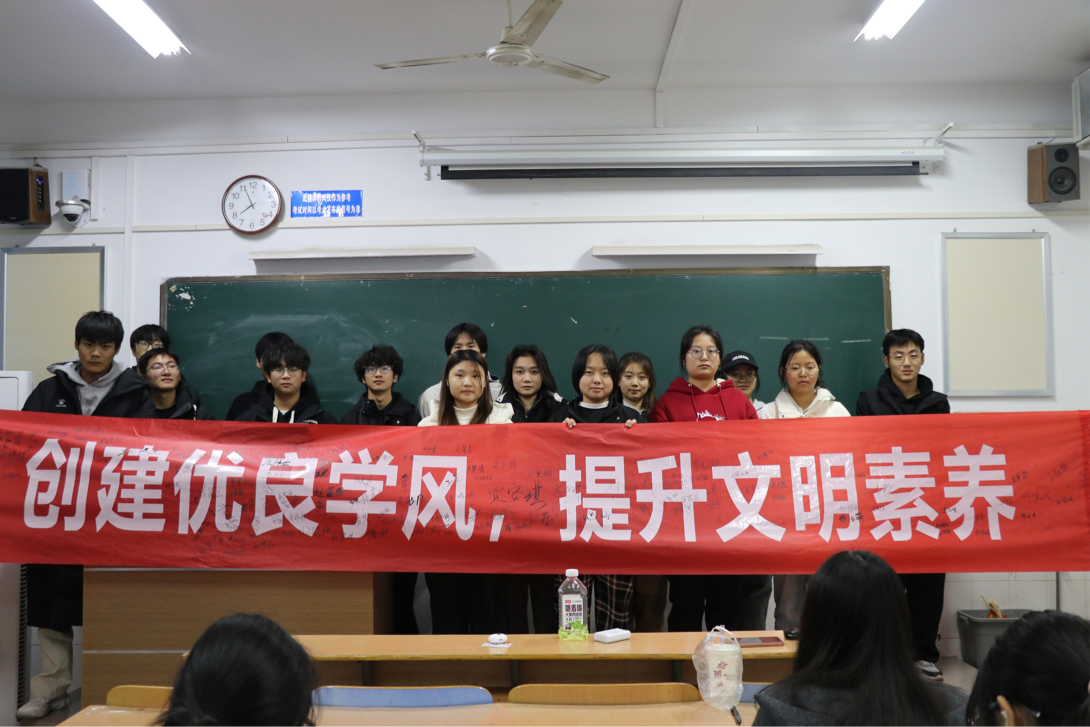 活动伊始,顾老师指出,学风建设是高校立德树人的重要载体,是引导青年大学生听党话、跟党走、立大志、明大德、成大才、担大任的重要途径,也是全面实现高质量人才培养目标的重要手段,并着重强调了加强学风建设和提升文明素养在大学生成长成才中的重要性,他希望同学们能积极参与学风建设活动,自觉养成良好的学习生活习惯。顾老师还结合学院学风建设主题教育方案对相关内容和要求进行了详细解读。随后,签名活动正式开始,同学们有序的在横幅上签下了自己的名字。每一个签名都代表着一份承诺,大家纷纷表达了对创建优良学风和提升文明素养的坚定信念。