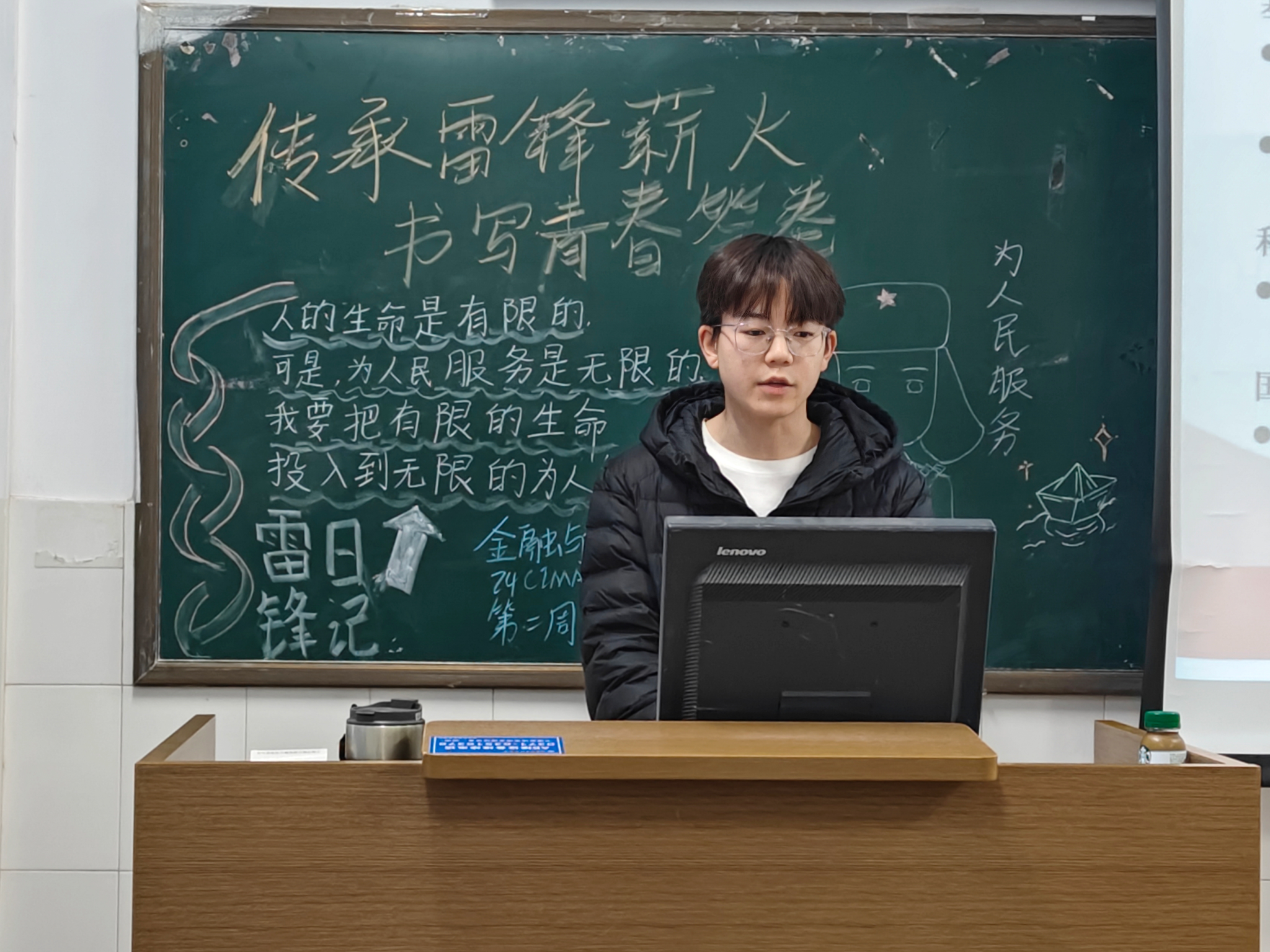 伴随着团歌响起,团课拉开帷幕。由主讲人带领大家回顾了雷锋同志短暂却光辉的一生,细致讲述了雷锋助人为乐、无私奉献的事迹,深刻解读雷锋精神的时代内涵。还联系“雷锋月”的起源和意义,呼吁同学们以实际行动传承雷锋精神,努力成为新时代雷锋精神的传播者和践行者。最后由学生代表上台发言,他结合自身实际情况,深入畅谈传承雷锋精神、书写青春答卷的理解,并鼓励同学们要像雷锋一样,坚守理想信念,勤奋学习专业知识,积极参与实践活动,努力成长为有理想、敢担当、能吃苦、肯奋斗的新时代优秀青年。