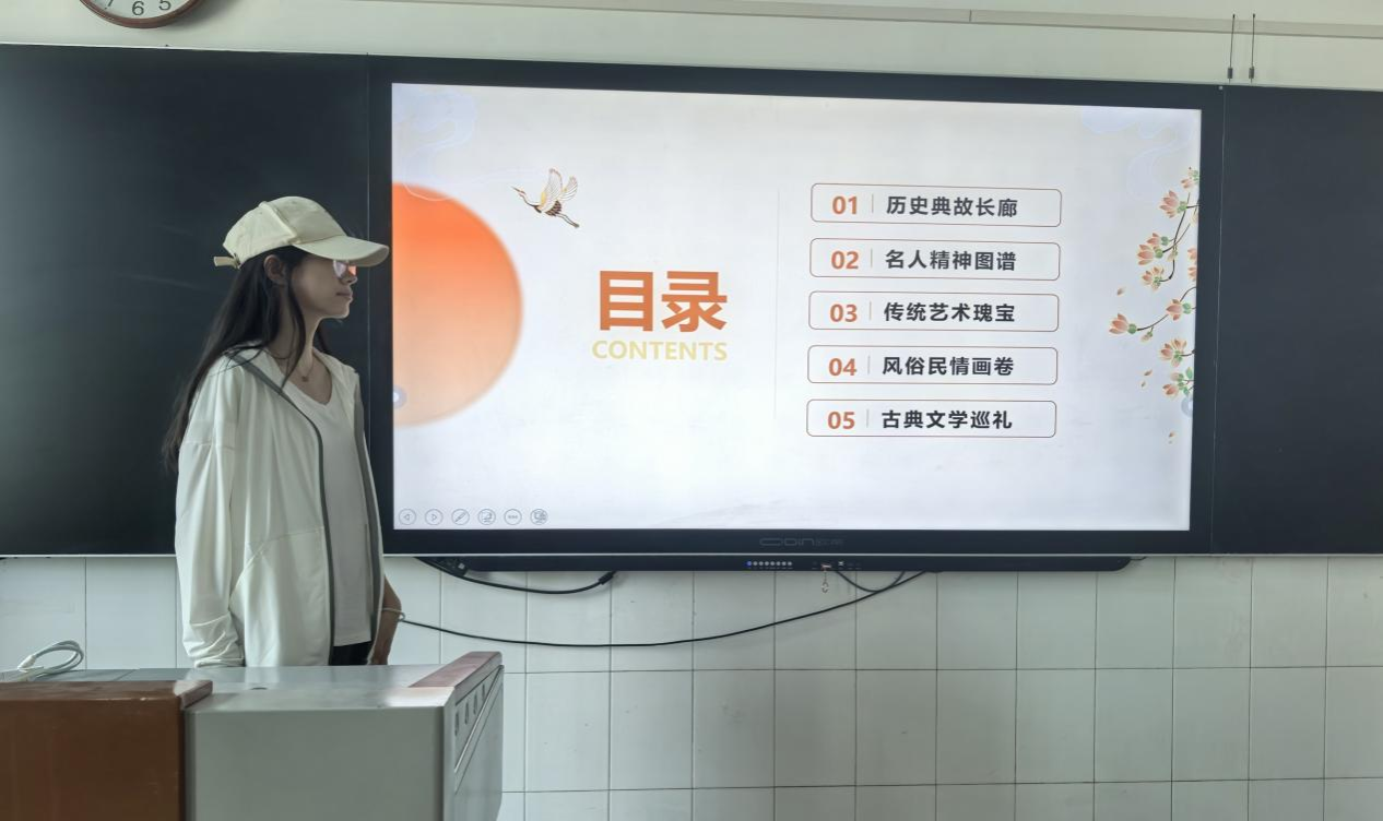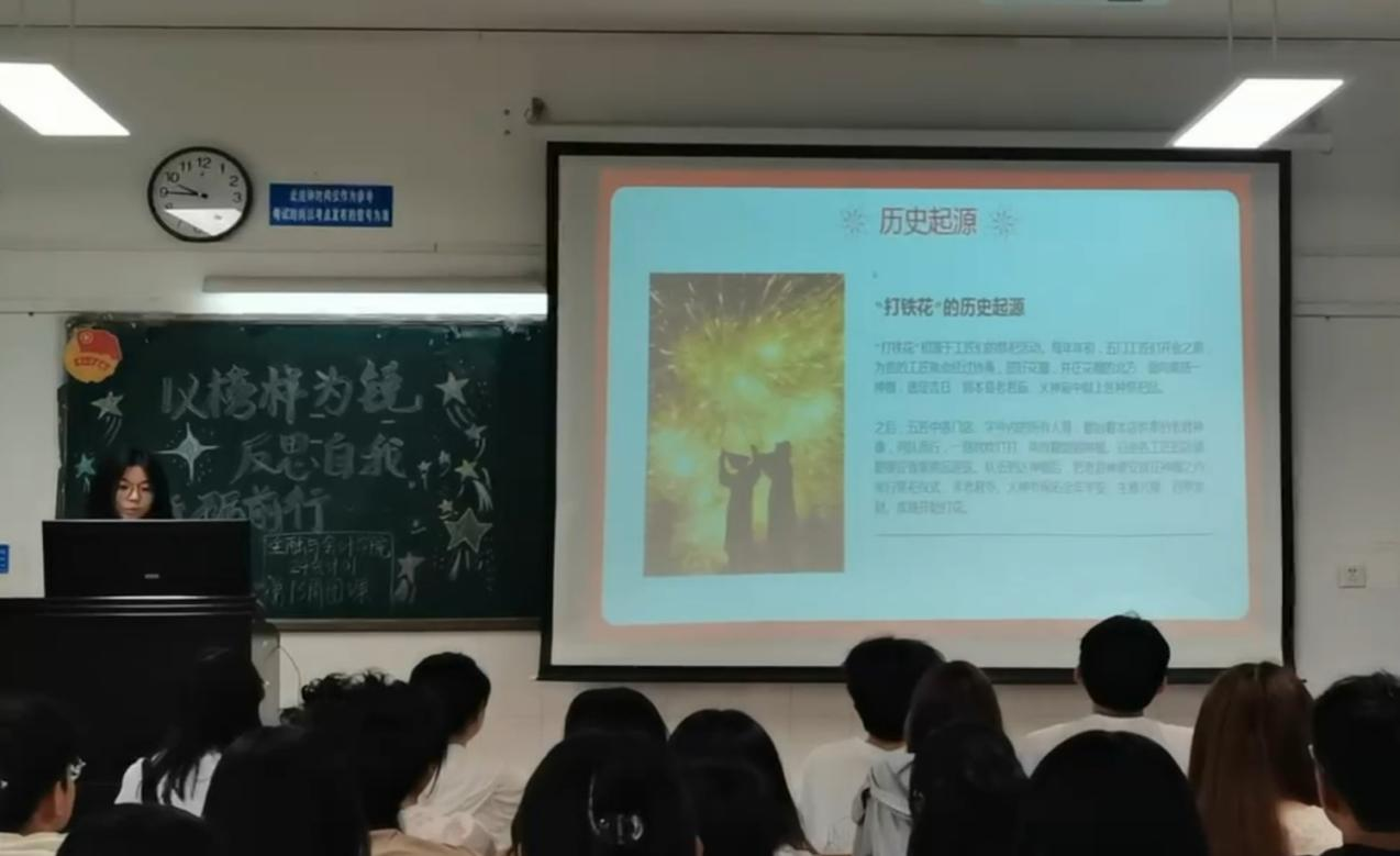 课间的教室里,同学们以多媒体展示与现场互动相结合的方式,围绕中华文化自信的历史根基、精神内核、时代价值等主题展开分享。有同学以历史典故中的长廊为切入点,通过精美的影像资料和生动讲解,展现古代匠人的艺术造诣与文化自信;另有同学翻开我国打铁花的历史长卷,从民间艺人挥击铁棒、铁水腾空绽放的绚丽瞬间,延伸至中华民族敢于突破、追求光明的精神内核,阐述这门古老技艺如何在传承与创新中,为文化自信注入生生不息的活力。每一个分享内容都激荡着大家对文化传承的热忱,尽显青年学子对文化自信的坚定追求。