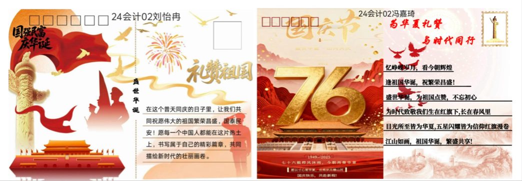此次电子明信片活动,以新颖有趣的形式吸引了我院众多学子参加,将宏大的家国主题转化为青年学子可感知、可参与、可创作的实践活动。不仅为我院学子们提供了展现创意的平台,更让爱国热情在沉浸式创作与互动中悄然升温。今后,我院将持续开展形式多样的爱国主义教育活动,引导全院学生以昂扬的姿态,将个人理想融入祖国发展,用青春力量书写时代华章,为实现中华民族伟大复兴的中国梦贡献自己的青春力量。