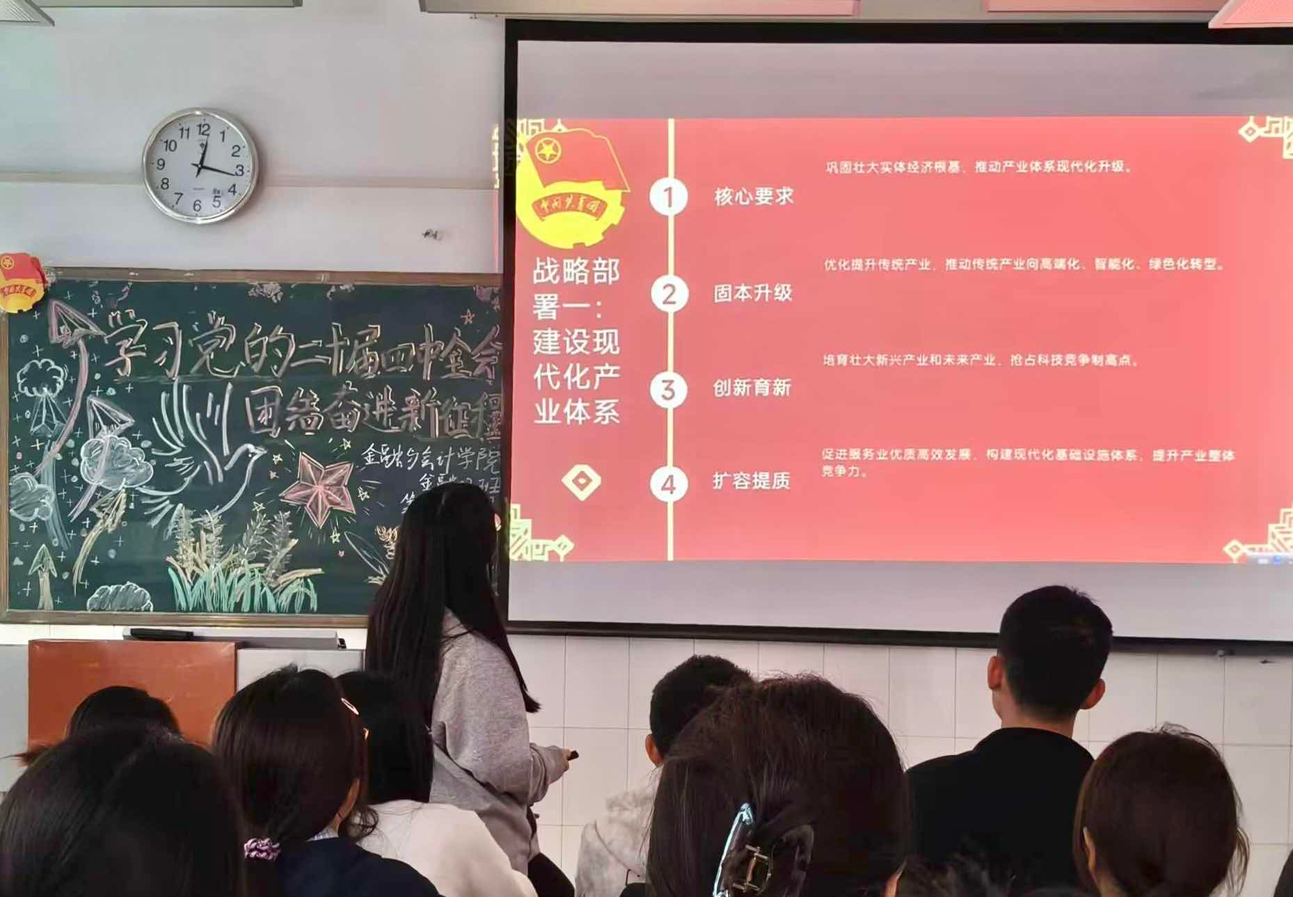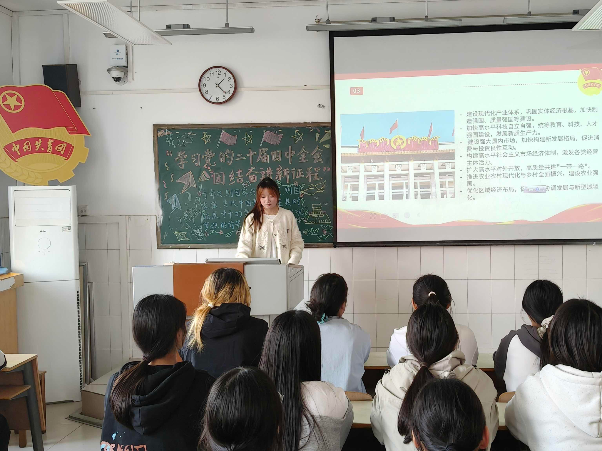 在嘹亮团歌声中,各班团课活动有序展开。活动伊始,各班团支书播放习近平总书记在党的二十届四中全会上发表的重要讲话视频,引导同学们深入思考迈向第二个百年奋斗目标伟大征程的使命担当。接着,团支书带领同学们学习《党的二十届四中全会公报》的核心内容,使同学们更加深刻认识到在以习近平同志为核心的党中央领航掌舵下,我国向中国式现代化迈出坚实步伐,为第二个百年奋斗目标奠定了坚实基础。团课过程中,各班还进行了小组交流互动,同学们踊跃发言,畅谈理想与未来,一致表示要坚定不移听党话、跟党走,坚决做到“两个维护”,自觉在思想上政治上行动上同党中央保持高度一致,深刻领悟“两个确立”的决定性意义,将个人理想融入党和国家事业发展大局。