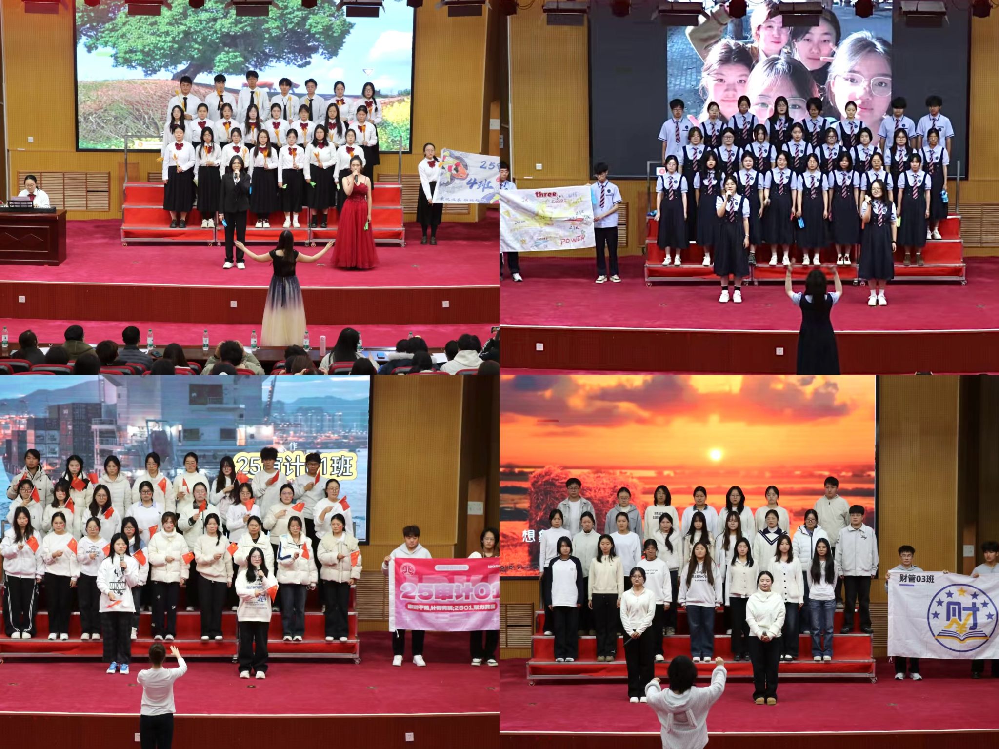 本次班歌大赛中,各班积极筹备、全力以赴,展现出扎实的舞台表现力与严谨的组织力,赛出风格、赛出水平。最终,25审计03班获一等奖,25审计04班,25会计06、07班获二等奖,25审计01班,25会计05班,25财管03班获三等奖,25注会02班,25金融0304班,25财管02班获优秀集体奖,25金融01班获最佳人气奖。