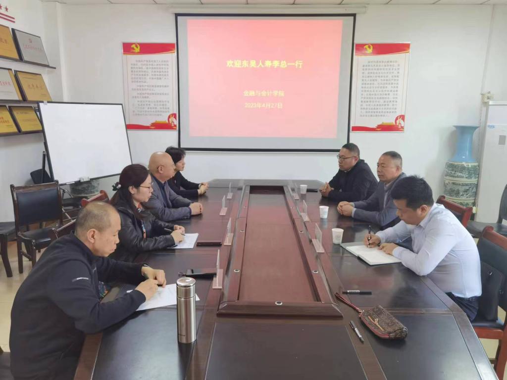 2023年4月27日上午,东吴人寿河南省分公司副总经理李强与高雷(东吴人寿河南省分公司团险部经理)、陈晨(东吴人寿郑州市公司团险部经理)等一行三人来到我校williamhill英国中文,与学院党委书记陈复昌、院长黄良杰、副院长邵翠丽、王培玲及保险专业负责人张智勇老师进行了深入交流。